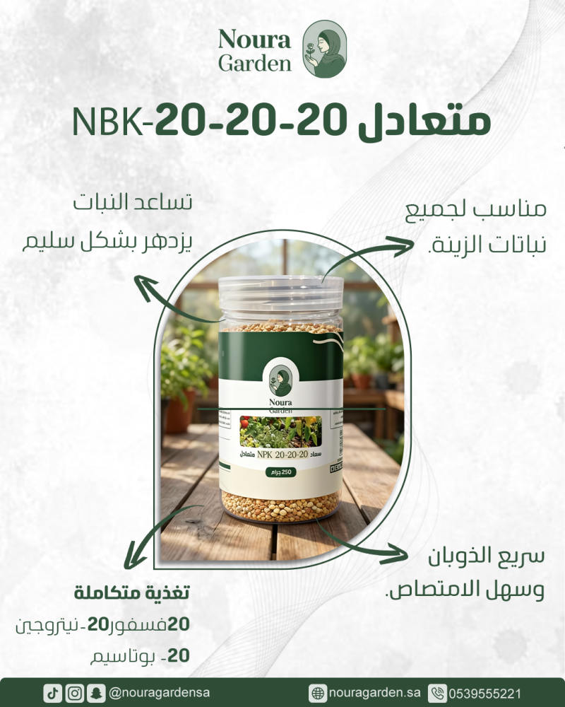 إذا كنت تبحث عن سماد مثالي في السعودية يضمن لنباتاتك نمواً متناسقاً وشاملاً، فإن سماد متعادل 20-20-20 من حديقة نورة خيارك المثالي. يتكون من تركيبة متطورة تحتوي على نسب متساوية من المغذيات أبرزها نيتروجين 20%، فسفور 20%، بوتاسيوم 20%، مما يوفر للنبات كل ما يحتاجه للازدهار في عبوة واحدة،